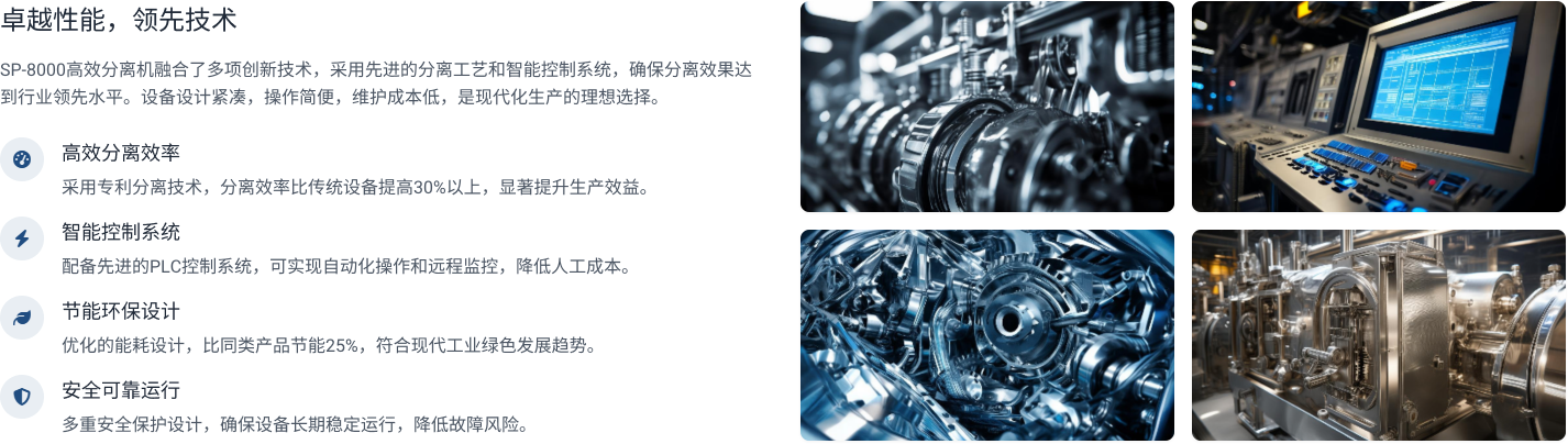SP-8000系列高效分离机是我公司自主研发的新一代分离设备,采用先进的分离技术,具有分离效率高、能耗低、操作简便等特点,广泛应用于新能源、化工、制药等行业。